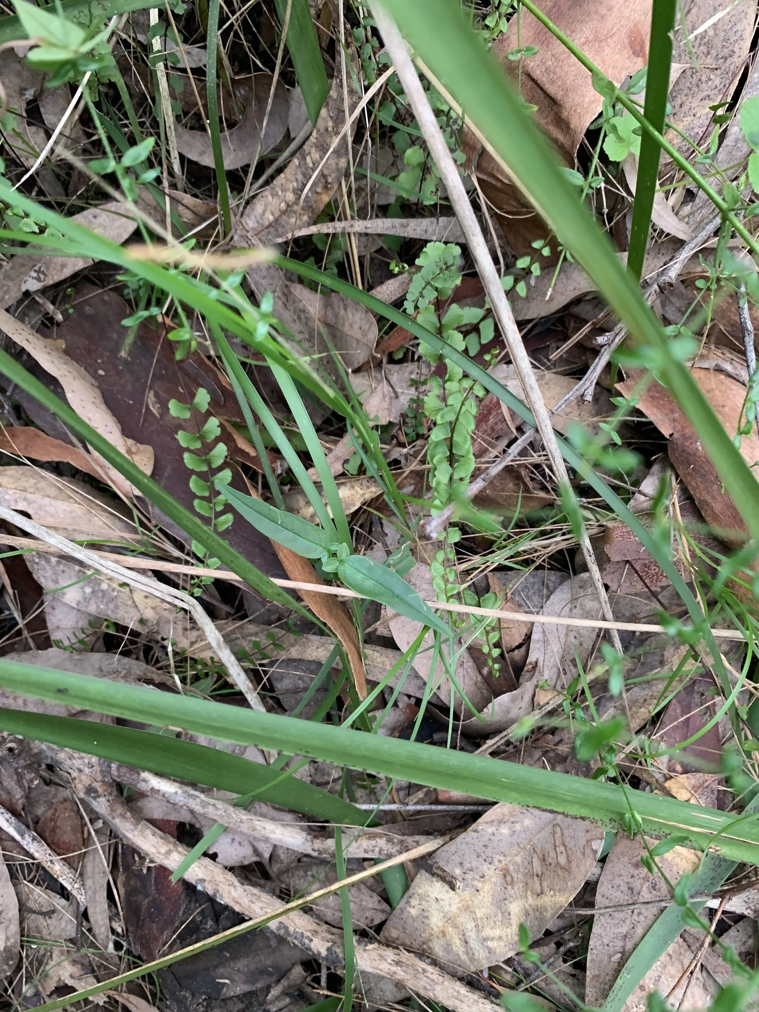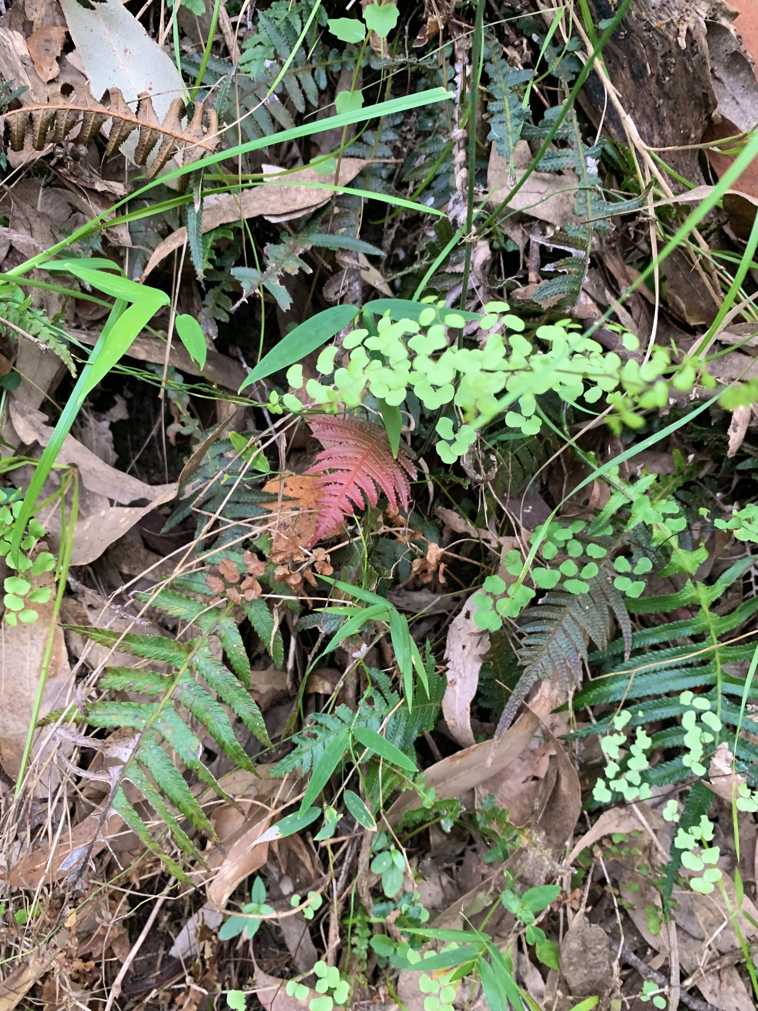 Lindsaea linearis, Pandorea pandorana, Prostanthera denticulata appearing in the leaf litter from the C. maculata canopy. A healthy and diverse array of PWSGF groundcovers and scramblers.