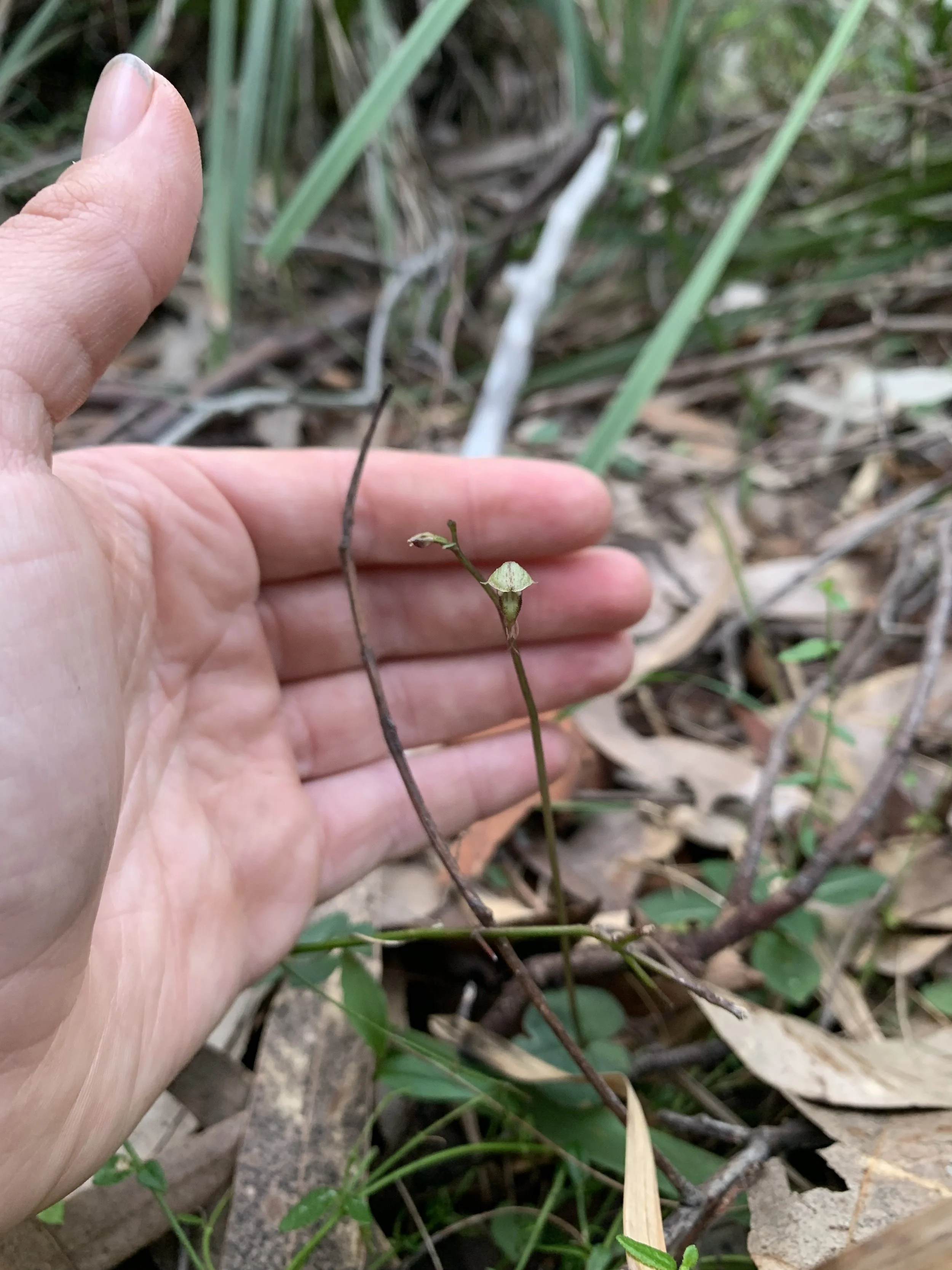 Acianthus fornicatus (Pixie Cap Orchid) enjoying the cooler weather and light conditions