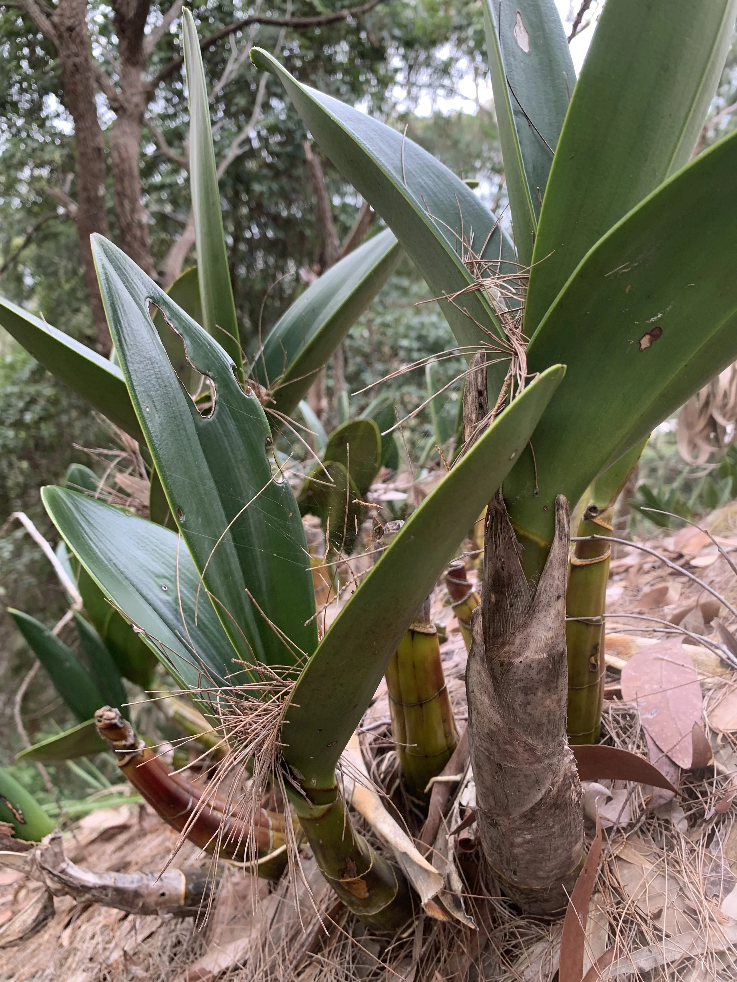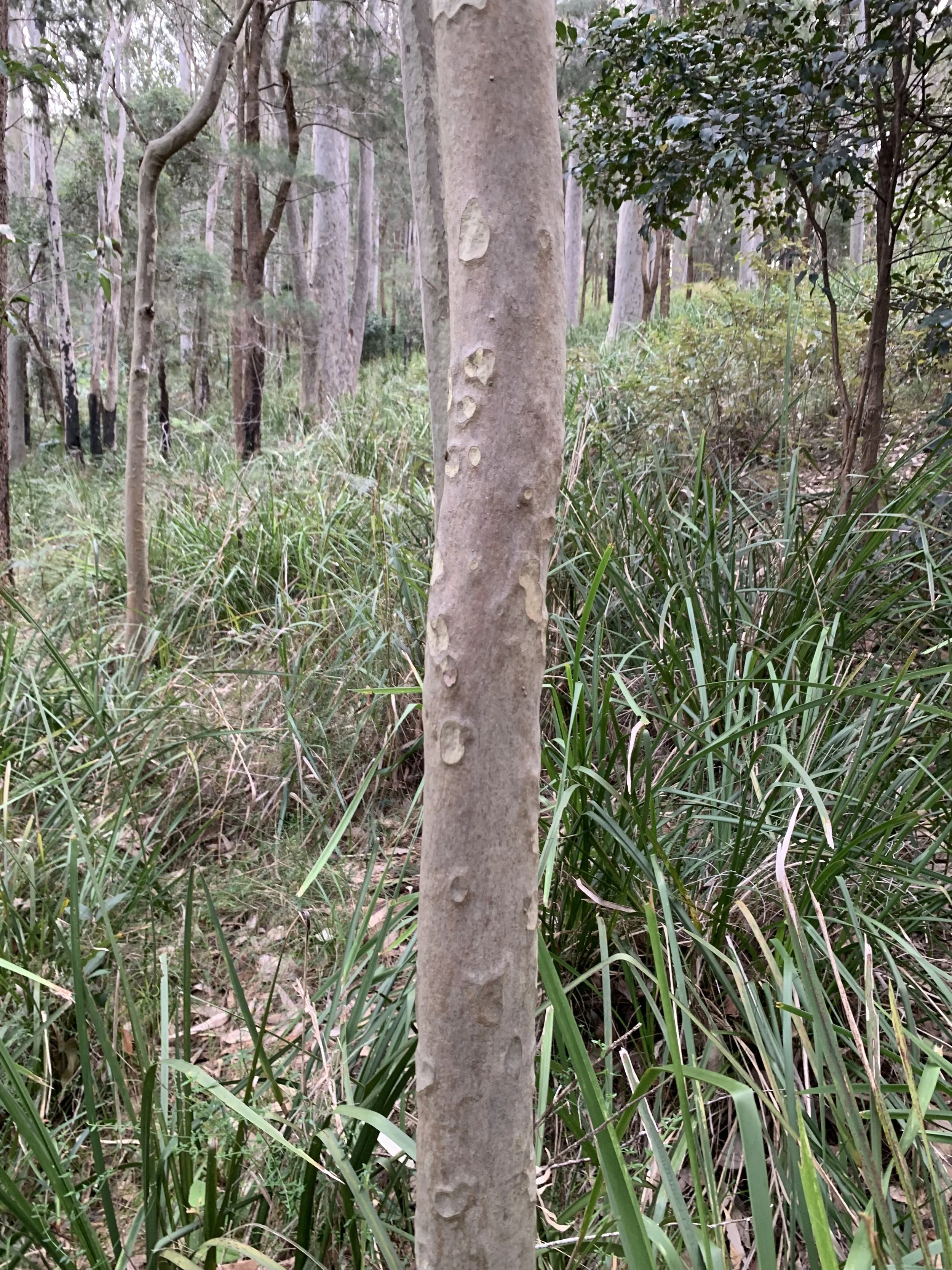 Sites that occurred on the flat where the soil had graded into a more clay-dominant substrate appeared to have a higher ground water content, but more open canopy which allowed light to reach the ground. These conditions had allowed for Poa affinis (Meadow Grass) and Acianthus fornicatus (Pixie Caps) to appear across the majority of the understorey. These areas, in large part, were characterised by higher canopy frequency of C. maculata (Spotted Gum), and fewer Livistona australis (Cabbage Tree Palm) and Allocasuarina torulosa (Forest She-Oak) than other, more densely vegetated zones.