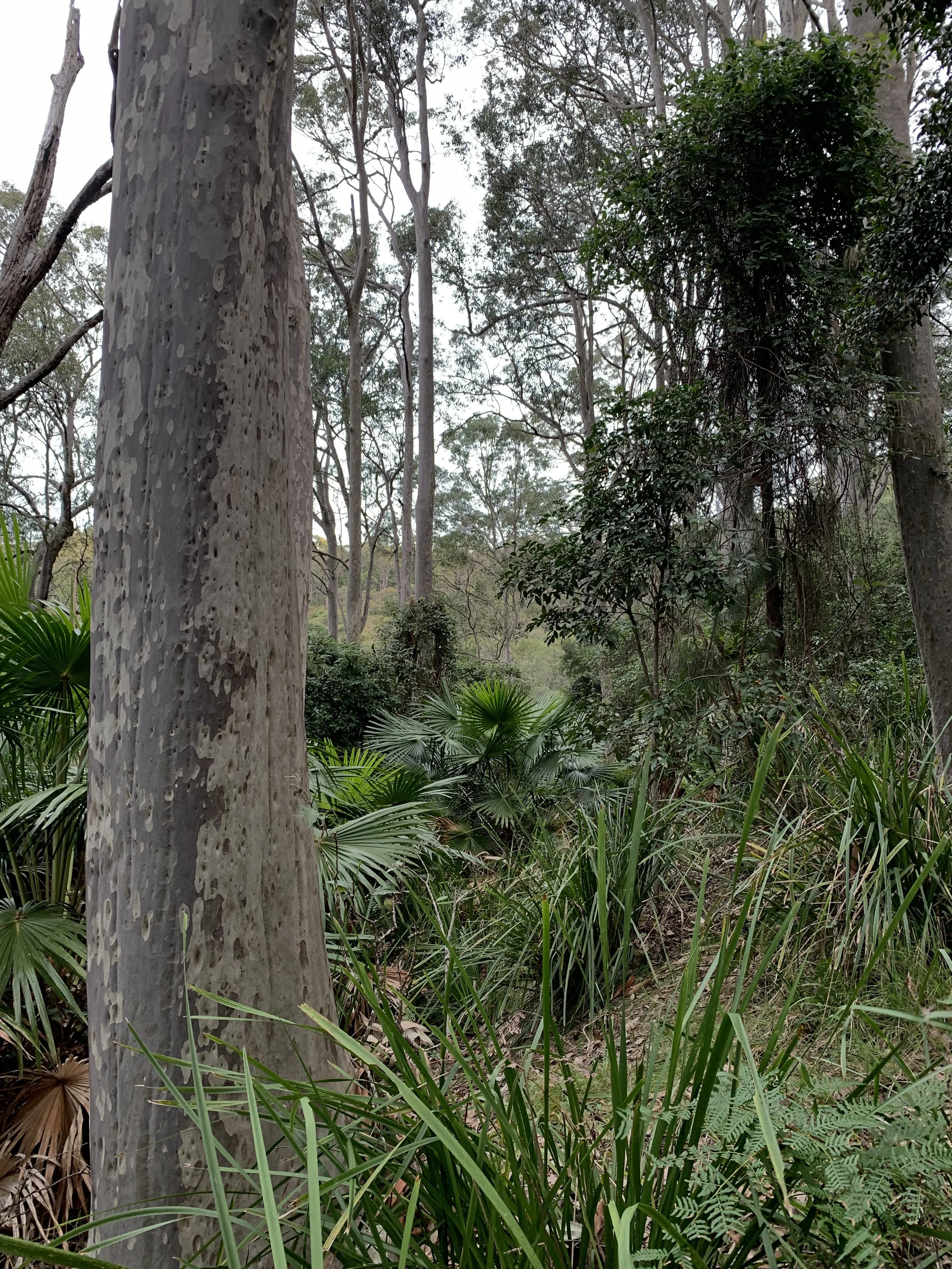 The understorey was varied with a greater density and preference for water-loving species on the lower slopes, which graded into a sparser and more diverse composition further up the escarpment. In some areas higher up, leaf litter formed a mosaic (perhaps due to ecosystem engineers such as the Menura novaihollandiae (Superb Lyrebird)) where in some places, it was almost completely absent.