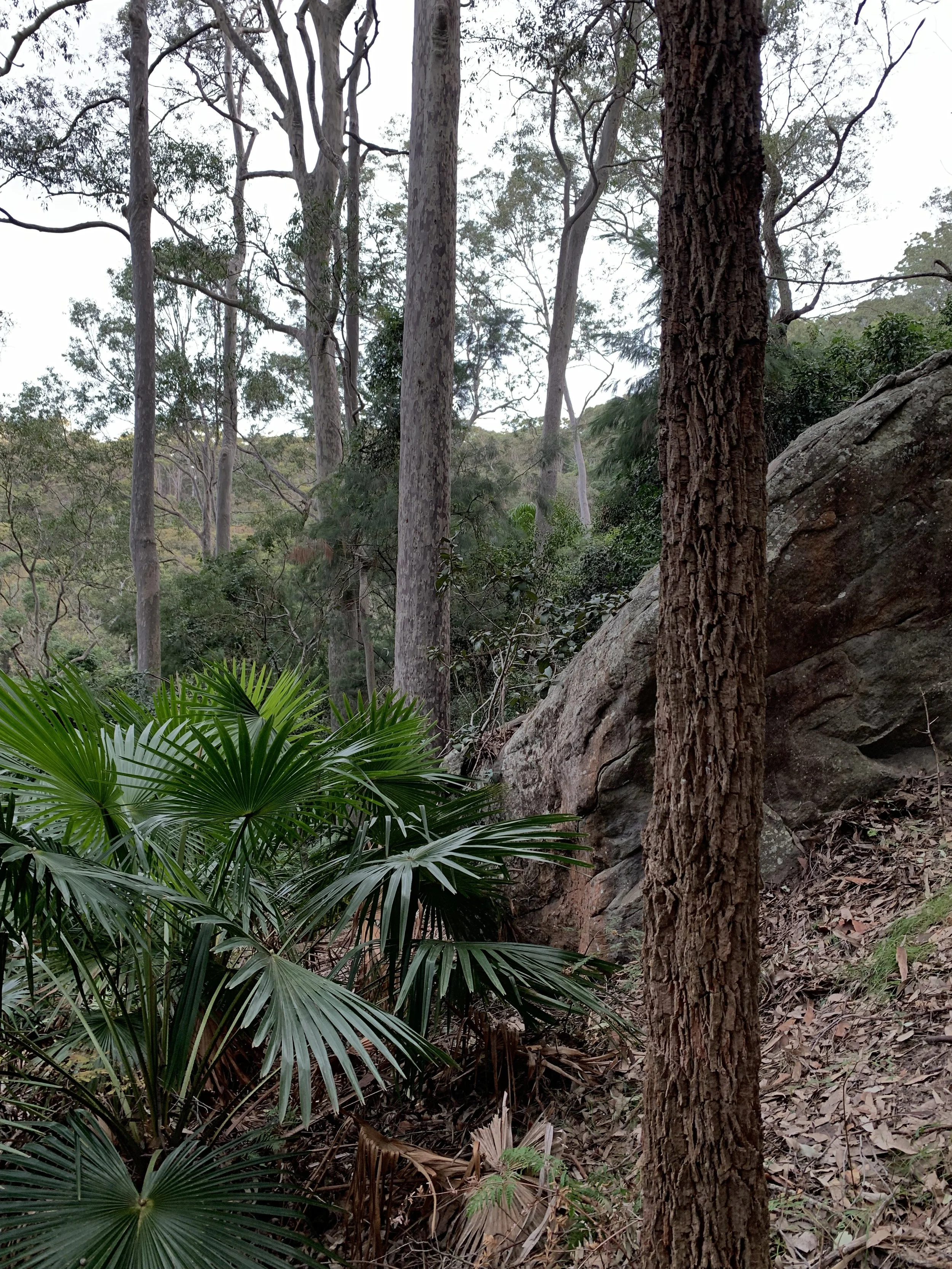 We note that Watagan slopes are characterised by steep topography, and significantly, sandstone boulders (NSW Department of Planning, Industry and Environment, n.d.). It is possible that the escarpment avoided development due to its steep gradient and the presence of large sandstone rocks. These boulders in themselves are important ecosystems for species such as the Dendrobium speciosum (Rock Lily) which had become scarce during initial clearing phases in the late 1800s (Pittwater Online News, 2012). We also noted the presence of species such as Adiantum aethepocium (Maiden Hair Fern), Doodia spp. (Rasp Ferns), and Arthropodium millieflorum (Pale Vanilla Lily) frequently appearing on peaty deposits in crags in the rocks.